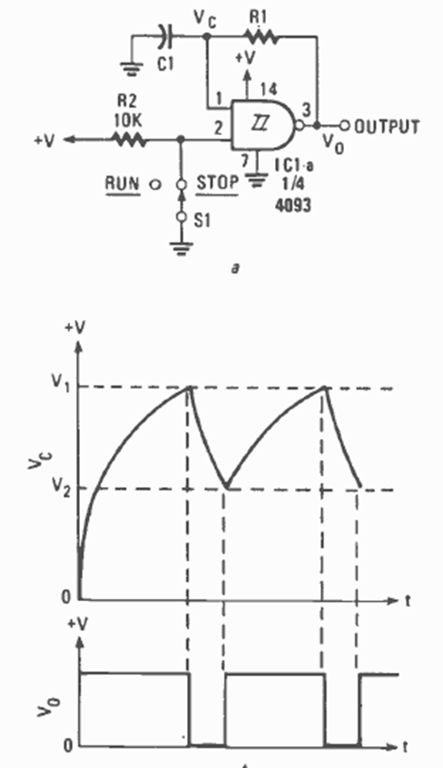This is one of many possible versions for an oscillator with the 4093. We found it in January 1987, Radio Electronics. The capacitor C1 determines the frequency together with R1.