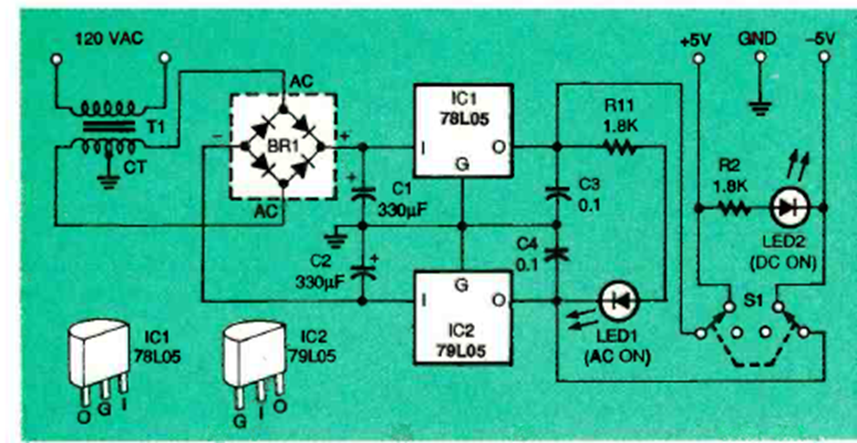 This circuit was found in the June 1996 issue of Electronics Now. Integrated circuits must be equipped with heat sinks, and the maximum current is 1 A.