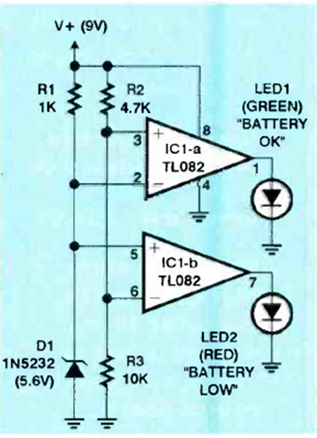 Two comparators are used to indicate the status of a 9 V battery. The circuit is from Electronics Now magazine, July 1998. Zerners of other values can be used to monitor other voltages.