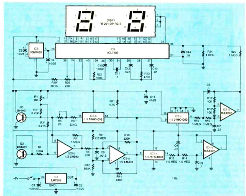 We found this circuit in an article in Electronics Now magazine from November 1997. The circuit uses two transistors to measure the temperature difference between them when one receives the wind.