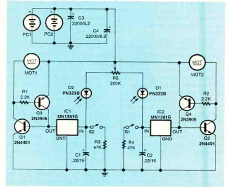 This circuit powered by photovoltaic cells was found in the November 1998 issue of Electronics Now magazine. The circuit uses two motors and can follow a line thanks to its sensors.