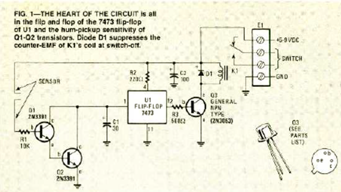 We found this circuit in the 1983 Radio Electronics Special projects magazine. The components are common, and the circuit drives a relay. The power supply must be isolated.
