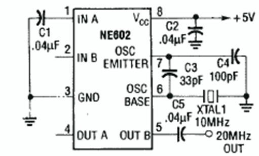 This circuit generates a 20 MHz sinusoidal signal from a 10 MHz crystal. It is found in the 1992 edition of the Electronics Experimenter Handbook. The circuit uses a single integrated circuit of the time.