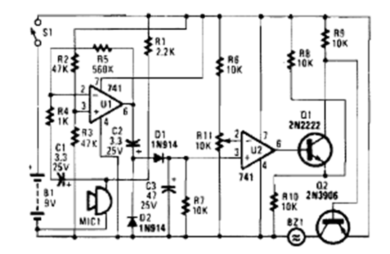 This alarm siren was found in volume 5 of the 1995 Encyclopedia of Electronic Circuits. The circuit powers a buzzer.