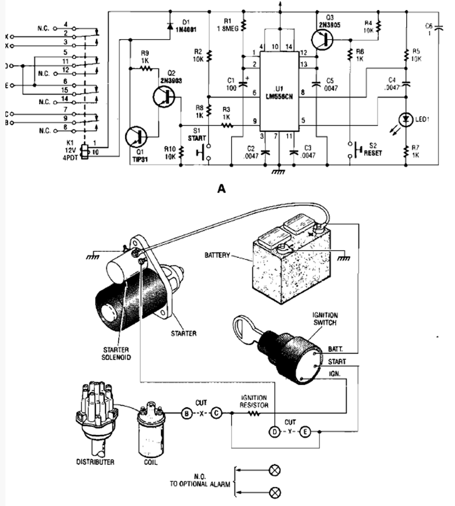 This circuit deactivates the ignition system after a certain time when you leave the vehicle. In case of a robbery, the thief sees the vehicle stop after a certain time when you leave and he takes over driving. The circuit is from a Popular Electronics from the 80s.