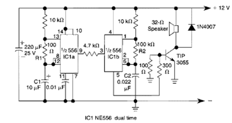 This circuit with two 555s was found in the Encyclopedia of Electronic Circuits volume 5 of 1995. The power is high due to the use of 2N3055.