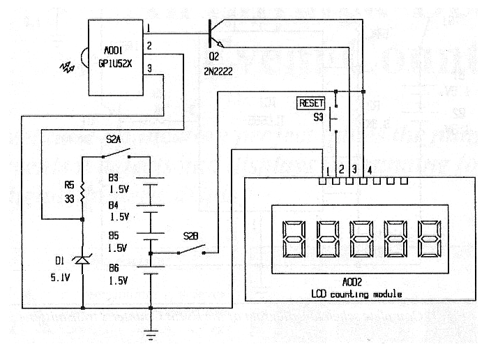 This circuit came out in a Modern Electronics from June 1990. In it we have a low frequency infrared pulse receiver. The transmitter is on the CB3249E. The two critical components of the receiver are the receiver module and the pulse counter module of type GP1U52X. This module was sold at the time by Radio Shack, but according to information there are equivalents. Note the additional 1.5V power supplied by a 4-cell battery holder. Other types of modules that have 5V logic input control can be used in the application.