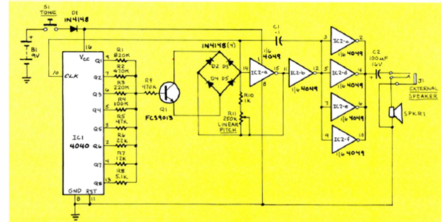 Found in the June 1987 issue of Radio Electronics magazine, this circuit uses well-known CMOS components. The circuit has a CMOS amplifier stage that drives a small speaker.