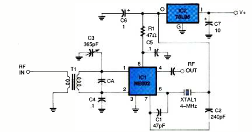 This circuit was found in the February 1997 issue of Electronics Now magazine. The frequencies depend on the crystal and other tuned circuits.