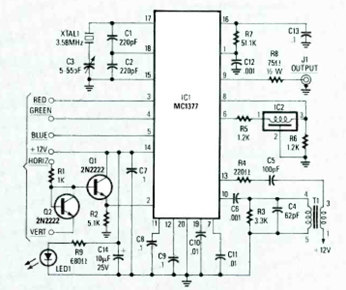 This circuit was found in the 1991 Electronics Experimenters handbook. It can be used to display RGB signals on old NTSC televisions.