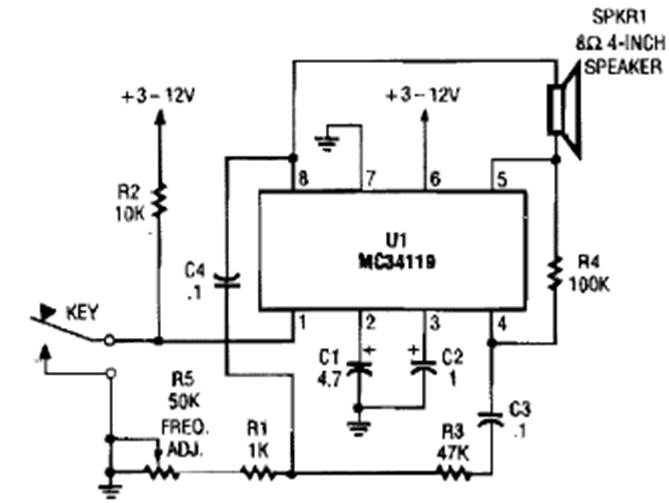 This variable frequency circuit was found in a Popular Electronics from the 90s. The circuit outputs to a small speaker and can be powered by voltages as low as 3 V.