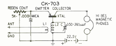 This circuit is from 1950, from the time when some still called the crystal triode transistor. The circuit is for the medium wave band and is listened to in high impedance headphones.