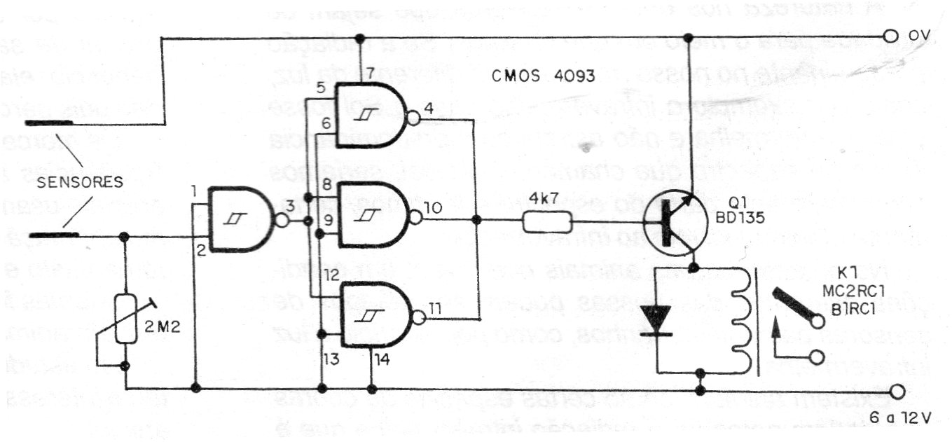 This circuit triggers a relay when the detected humidity falls below a value. The system can be used in an automatic irrigator. The supply voltage must be equal to that of the relay and the sensor consists of two buried metal rods. The circuit should not be powered by a transformerless supply.