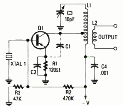 This circuit generates a signal corresponding to the harmonic of the crystal used. The frequency is given by the adjustment of C3 and L1. The circuit is from a Radio Electronics magazine from November 1986. Q1 can be the 2N2222.