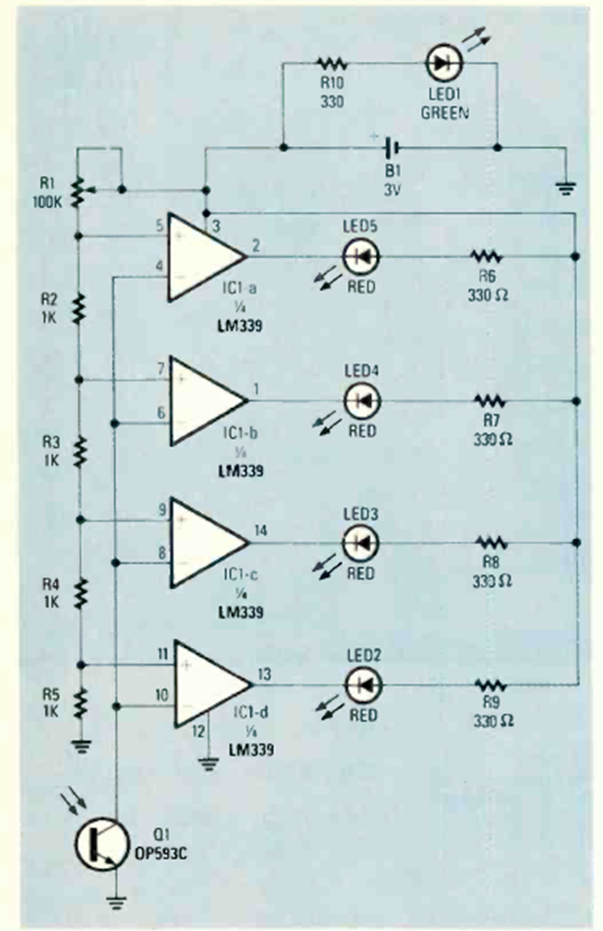 This simple bargraph photometer appeared in the November 1987 issue of Radio Electronics magazine. The sensor is a phototransistor and the scale depends on resistors at the comparator inputs.