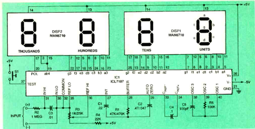 In the figure we have the basic way of using the 3-and-a-half-digit counter 7107. The circuit is from an Electronics Now from November 1996. It uses two dual displays.