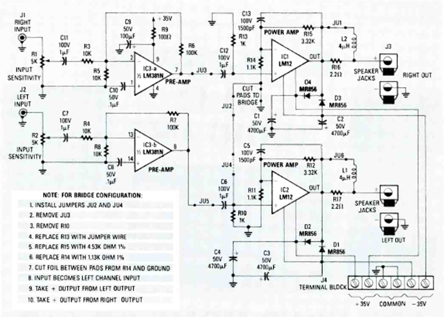 This high-power amplifier with only 4 integrated circuits was found in the 1990 special issue of Radio Electronics Experimenter magazine. The circuit reaches 100 W per channel.