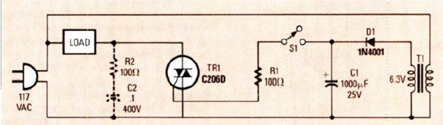 This control circuit using a low voltage switch was found in the September 1987 Radio Electronics magazine. The triac must be matched to the load and the mains voltage.
