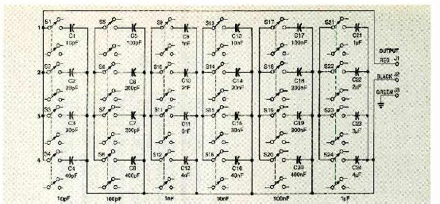 This bench circuit was found in the February 1998 issue of Electronics Now magazine. It can be used to obtain a very wide range of capacitances for testing.