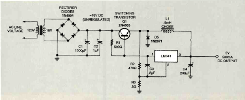 This hybrid power supply circuit was found in the August 1997 issue of Electronics Now magazine. The power transistor and the integrated circuit must be provided with heat sinks.
