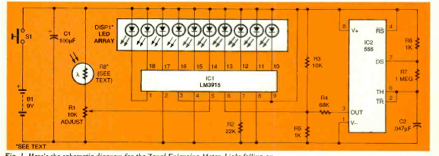 This circuit was found in the November 1966 issue of Electronics Now magazine. It uses an LDR as a sensor and has a Bargraph scale with the well-known LM3914.