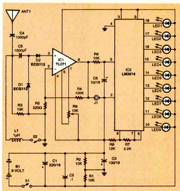 This circuit detects the presence of strong signals from spy transmitters, enabling their location. The circuit is from the July 1999 Electronics Now magazine.