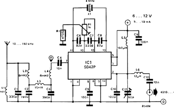 With this circuit, signals in the range of 10 kHz to 150 kHz can be received at close to 4 MHz from a shortwave receiver. The circuit is from a 303 Circuits from the 90s.