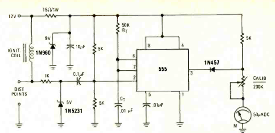 Another of the many tachometer circuits we have on our site. This one is from the September 1976 Radio Elecronics magazine. The circuit is connected to the platinum contacts of a car or to a sensor.