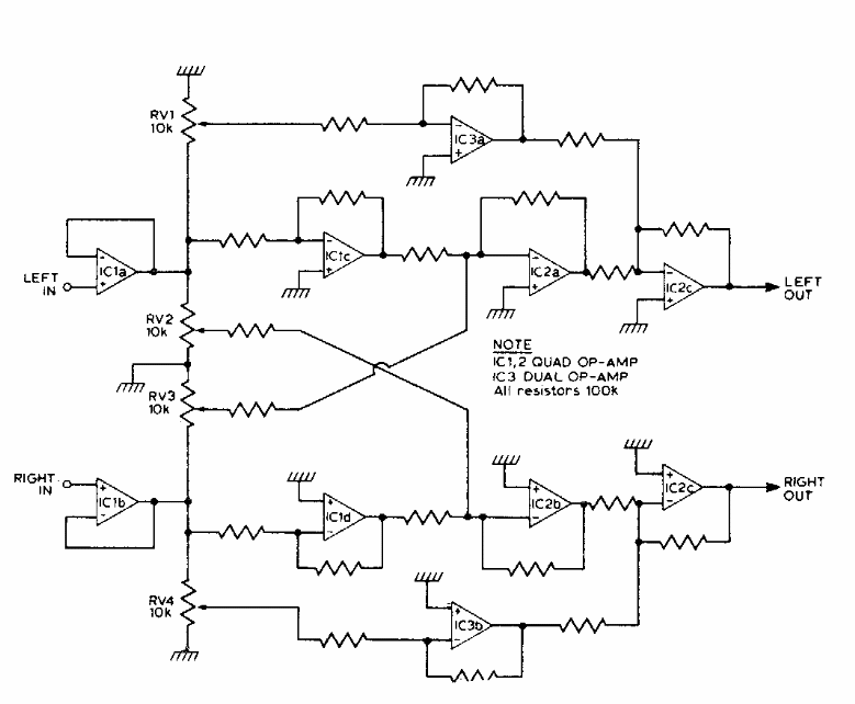 In fact, what this circuit does is work the two channels of a stereo system producing two additional channels. Thus, the system becomes a 4-channel system for home theater, for example. The idea can be worked out to use any operational.
