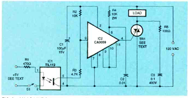 This circuit uses an optocoupler to switch a load on the power grid. The circuit is from Electronics Now magazine, July 1995. The CA3059 is not common today.