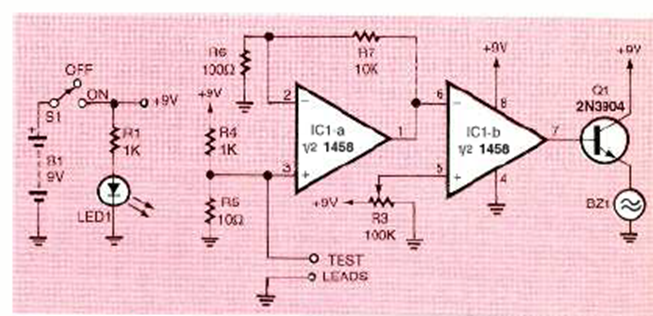 We found this circuit in the August 1994 Electronics Now magazine. The circuit is based on the MC1458 dual operational circuit, which is equivalent to the 741. The indication is via a buzzer.