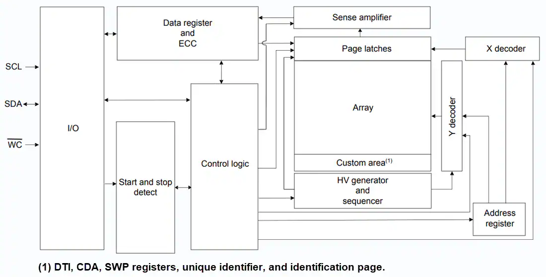 STMicroelectronics M24M02E-U 2M-Bit I2C-Compatible EEPROM is organized as 256K x 8 bits. It can operate with a supply voltage from 1.6V to 5.5V and a clock frequency of up to 1MHz over an ambient temperature range from -40°C to +85°C. The device offers three 8-bit registers: the device type identifier (DTI) register, the configurable device address (CDA), and the software write protection (SWP) register. The device also offers a 256-byte identification page. This additional page stores a 128-bit (16-byte) unique factory-programmed serial number, locked in read-only mode at factory delivery. The uniqueness of the serial number is ensured across the whole portfolio of serial EEPROMs manufactured by STMicroelectronics, offering a unique identifier.